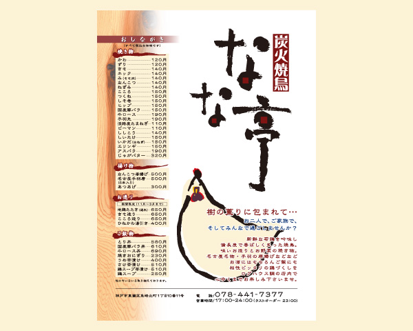 グラフィックデザイン 制作物ポスター、イラストなど制作内容樹の薫りに包まれるログハウス調の店内で、老若男女問わず食事を楽しんで頂きたいというオーナーの想いが伝わるように、親しみやすい色使いや和風テイストのイラストを描き、スッキリとわかり易いデザインにしました。クライアント炭火焼鳥なな亭地域兵庫県神戸市事業内容炭火焼鳥