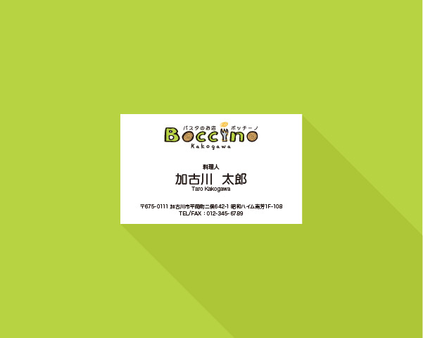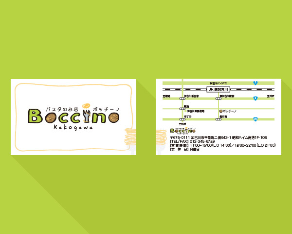 グラフィックデザイン 制作物ロゴマーク、名刺、ショップカード制作内容店舗ロゴをはじめ名刺、ショップカードのデザインをしました。気軽に入れて親しみやすい雰囲気のお店にしたいというオーナーの想いを表現しました。クライアントパスタのお店Boccino地域兵庫県加古川市事業内容パスタ専門店