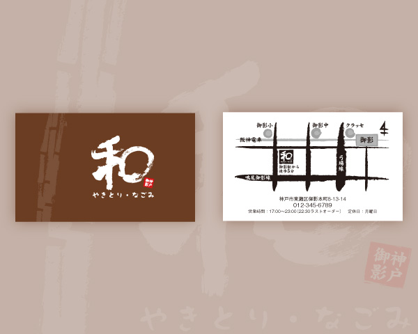 グラフィックデザイン 制作物ロゴ、ショップカードなど制作内容店舗名の「和」の文字はオーナーが想いを込めて書かれた自筆です。それをベースにロゴやショップカードに展開しました。また、内装に使用されている「竹」をモチーフにしたイラストを和風に表現し、ワンポイントに使用しております。クライアントやきとり和(なごみ)地域兵庫県神戸市事業内容やきとり専門店
